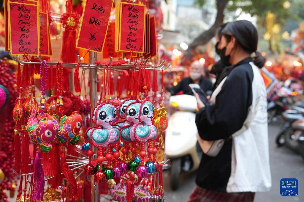 1月22日,在位于越南首都河内的马市街,琳琅满目的春节装饰品中不乏蛇年饰品。