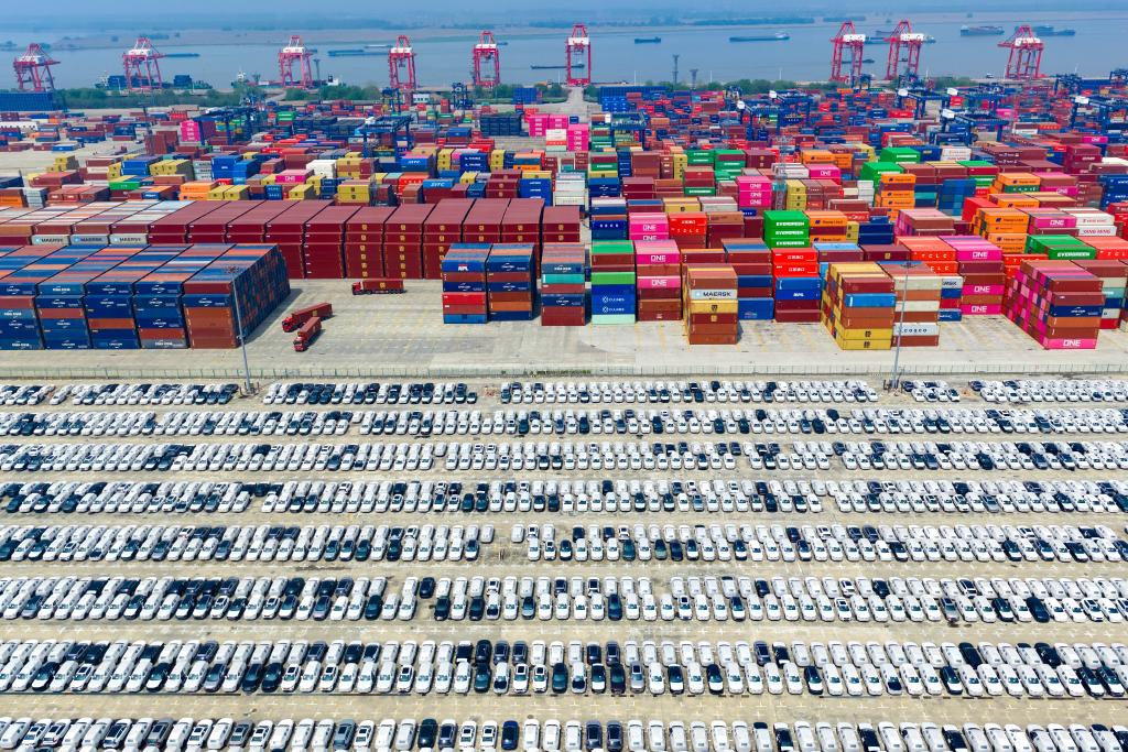 这是4月10日在江苏省港口集团南京港龙潭港片区拍摄的等待远销的汽车(无人机照片)。 杨素平 摄