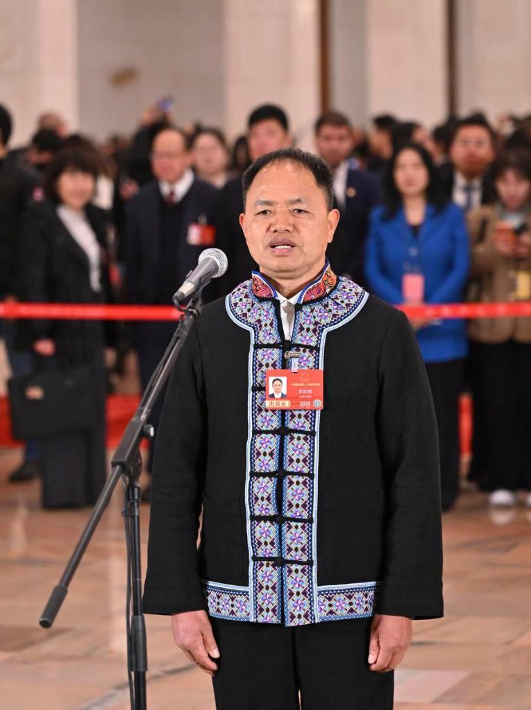 Nong Jiagui, a deputy to the 14th National People's Congress (NPC), attends a group interview ahead of the opening meeting of the fourth session of the 14th NPC at the Great Hall of the People in Beijing, capital of China, March 5, 2026. (Xinhua/Li Xin)