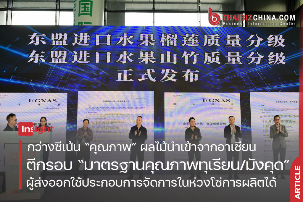 ในงานประชุมว่าด้วยการพัฒนาอุตสาหกรรมจีน-อาเซียน และงานจับคู่ธุรกิจผลไม้กว่างซี ที่จัดขึ้นเมื่อวันที่ 7 พฤศจิกายน 2568 ที่นครหนานหนิง เขตฯ กว่างซีจ้วง ได้มีการประกาศมาตรฐานการกำหนดคุณภาพสินค้าผลไม้จากอาเซียน จำนวน 2 ฉบับ ในทุเรียน และมังคุด เพื่อกำหนดแนวทางและสร้าง “บรรทัดฐานกลาง” ด้านคุณภาพสินค้า