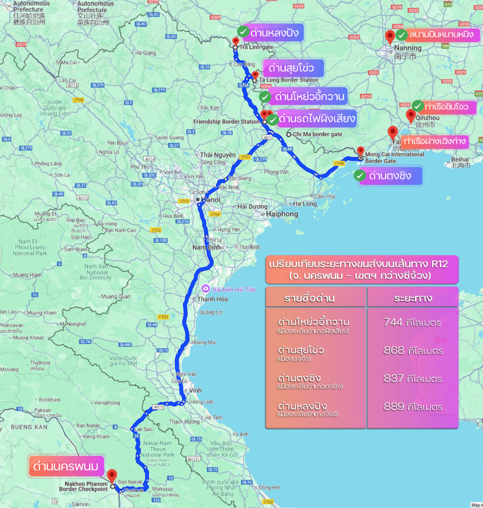 • การขนส่งทางทะเล : ท่าเรือแหลมฉบัง/ท่าเรือกรุงเทพฯ – ท่าเรือชินโจว (เมืองชินโจว เขตฯ กว่างซีจ้วง)