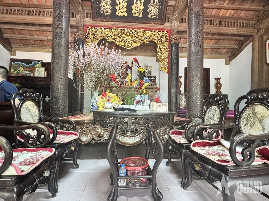 Trải qua năm tháng, các cột kèo, rui mè, bậu cửa tuy có chỗ mối mọt song sau xử lý vẫn bền chắc, bóng lên màu thời gian. Chính giữa gian nhà treo bức hoành phi “Đức thụ tư bồi”, hiểu nôm na là bồi dưỡng vun đắp cây đạo đức, ý nói nuôi dưỡng đức hạnh làm nền tảng cho gia tộc trường thịnh. Bốn cây cột gỗ ở hai bên gian giữa ốp hai cặp câu đối, chính giữa là chiếc sập gụ trải chiếu hoa. Phía bên ngoài kê bộ bàn ghế khảm xà cừ trang nhã. Trước nhà trồng những cây mộc cổ thụ trên 100 năm tuổi, hương hoa dè dặt bay thoang thoảng, ướp những trầm mặc, cổ kính vào không gian. Vào tiết nóng nực, chỉ bước tới hiên nhà đã có thể cảm nhận một không gian dịu mát đối lập với ngoài trời.